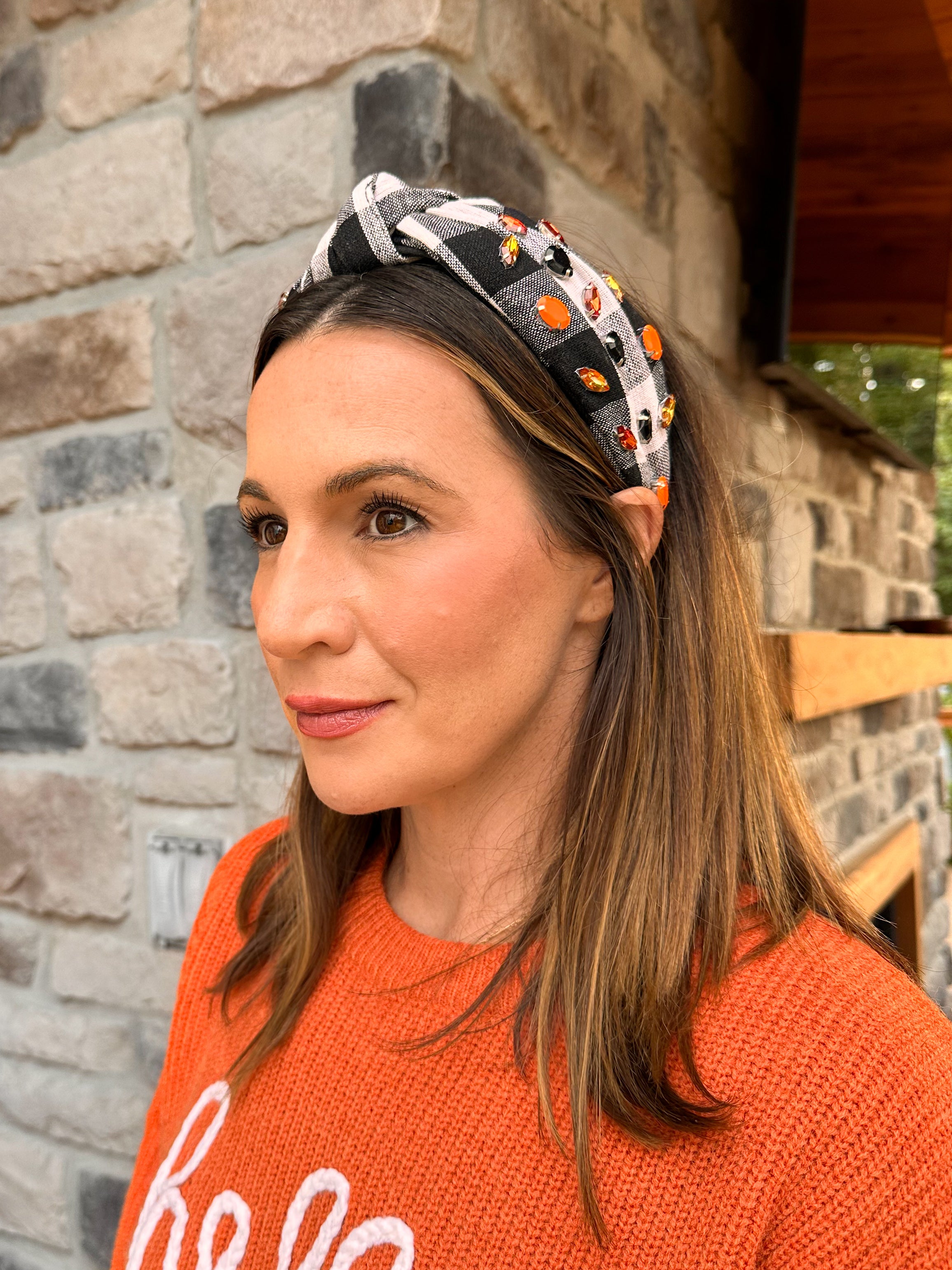 Complete your autumn look with a touch of whimsy and sparkle in our Fall Headband! Featuring a classic black-and-white buffalo check base adorned with orange and black rhinestones, this accessory strikes the perfect balance of cozy charm and festive shine. From apple picking to pumpkin carving, it’s the versatile piece your fall wardrobe needs.