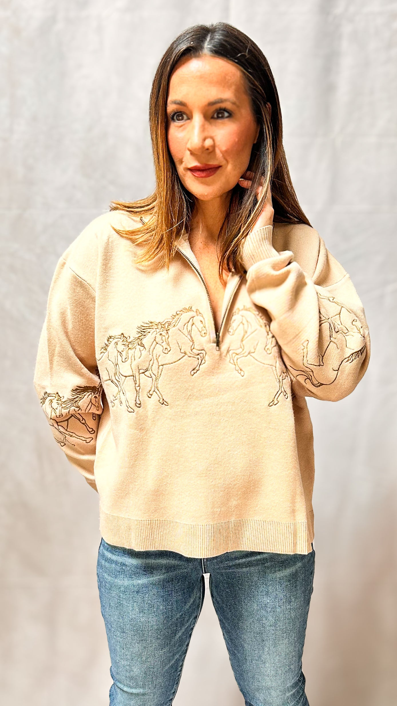Equestrian elegance, elevated. The Windsor Top features a high neckline, quarter-zip front, and beautifully detailed horse embroidery across the chest. The cozy knit fabric gives it structure without stiffness, while the chestnut brown trim adds just the right contrast. It’s the kind of piece that feels special, but wears effortlessly—whether you're heading to the stables or just channeling the vibe.