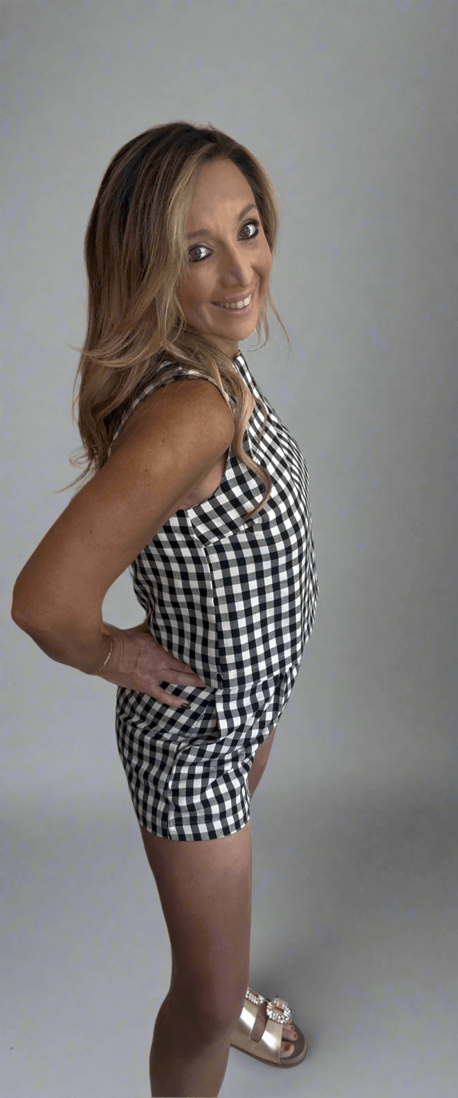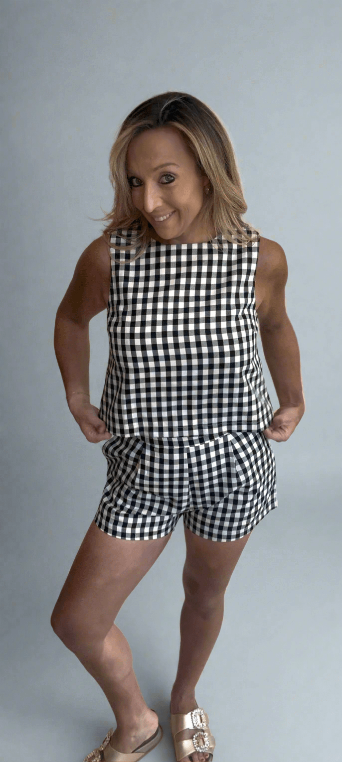 The Georgia Gingham Set offers timeless black and white gingham style with effortless comfort. Featuring a sleeveless, easy-fit mid-length top with a convenient back zip, it pairs perfectly with matching shorts that include pockets and a back zip entry. This set combines classic charm with practical details, making it an ideal choice for stylish, everyday wear.