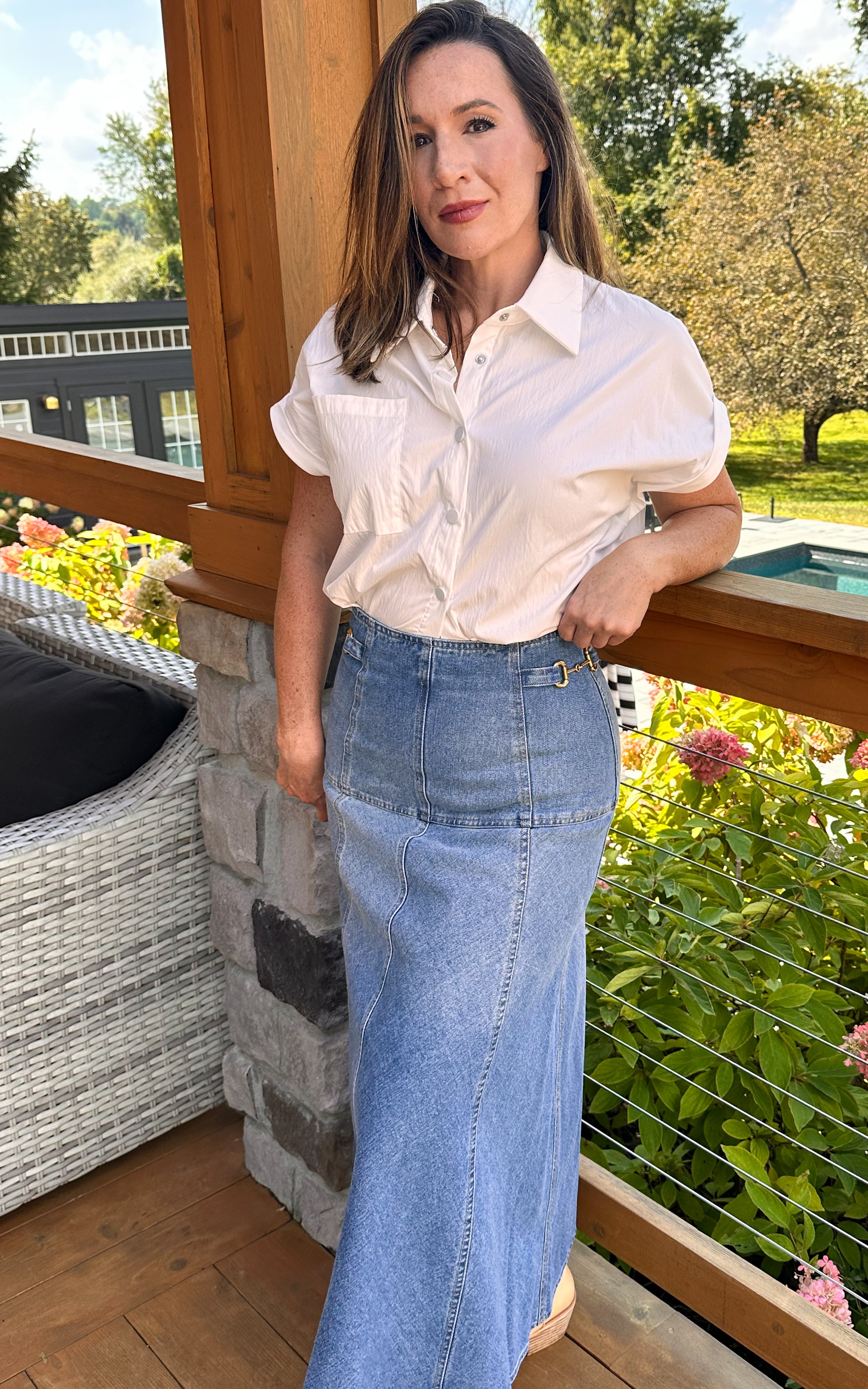 Classic denim, reimagined with a luxe twist. The Bristol Skirt is a longline denim silhouette featuring sleek side panels adorned with gold horse-bit style buckles on each hip—bringing a hint of equestrian glam to a timeless shape. With a structured fit and subtle A-line cut, it’s the kind of piece that feels elevated yet wearable, no matter where the day takes you.