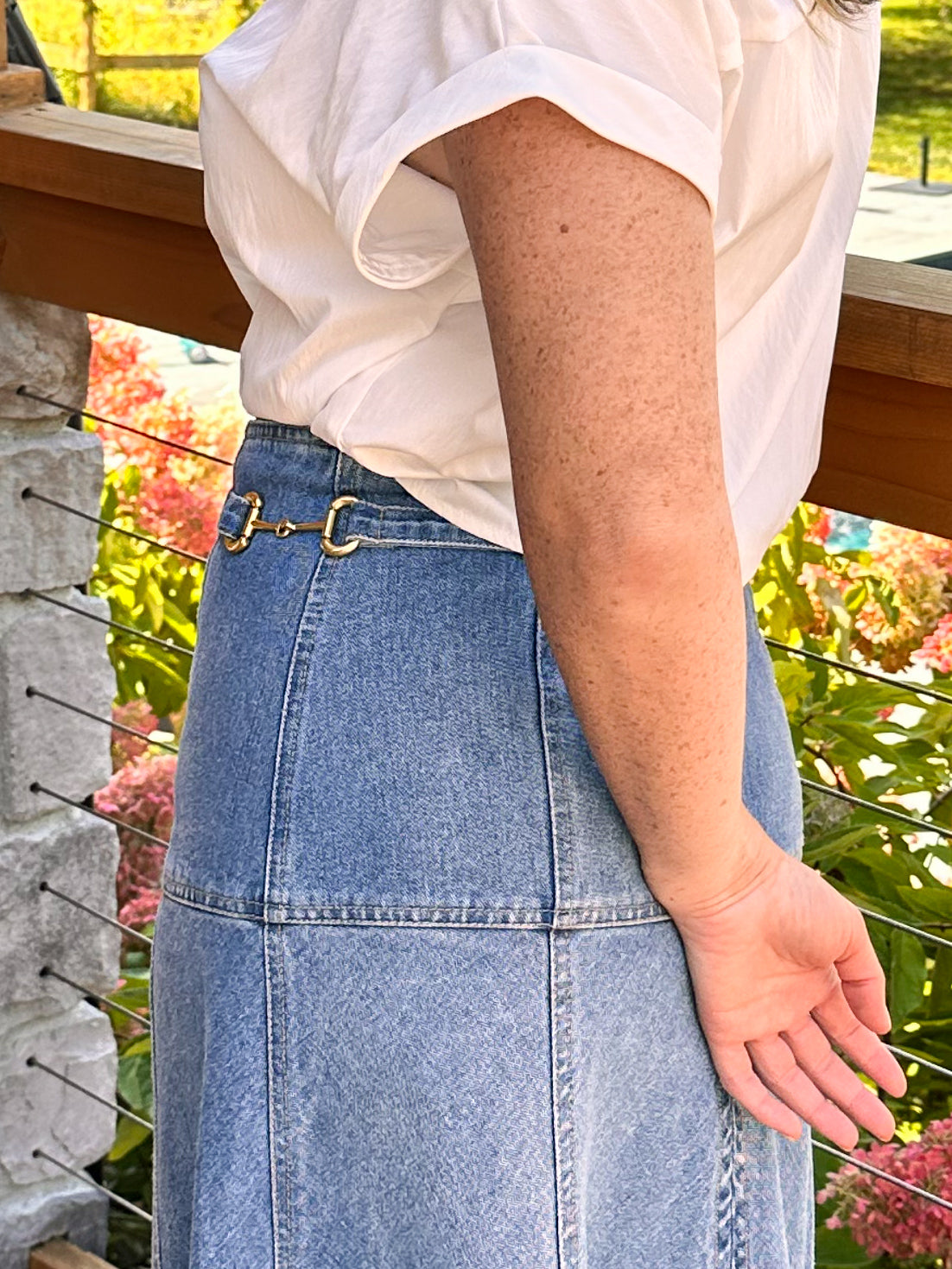 The Bristol Skirt – Denim with Gold Horse Buckles