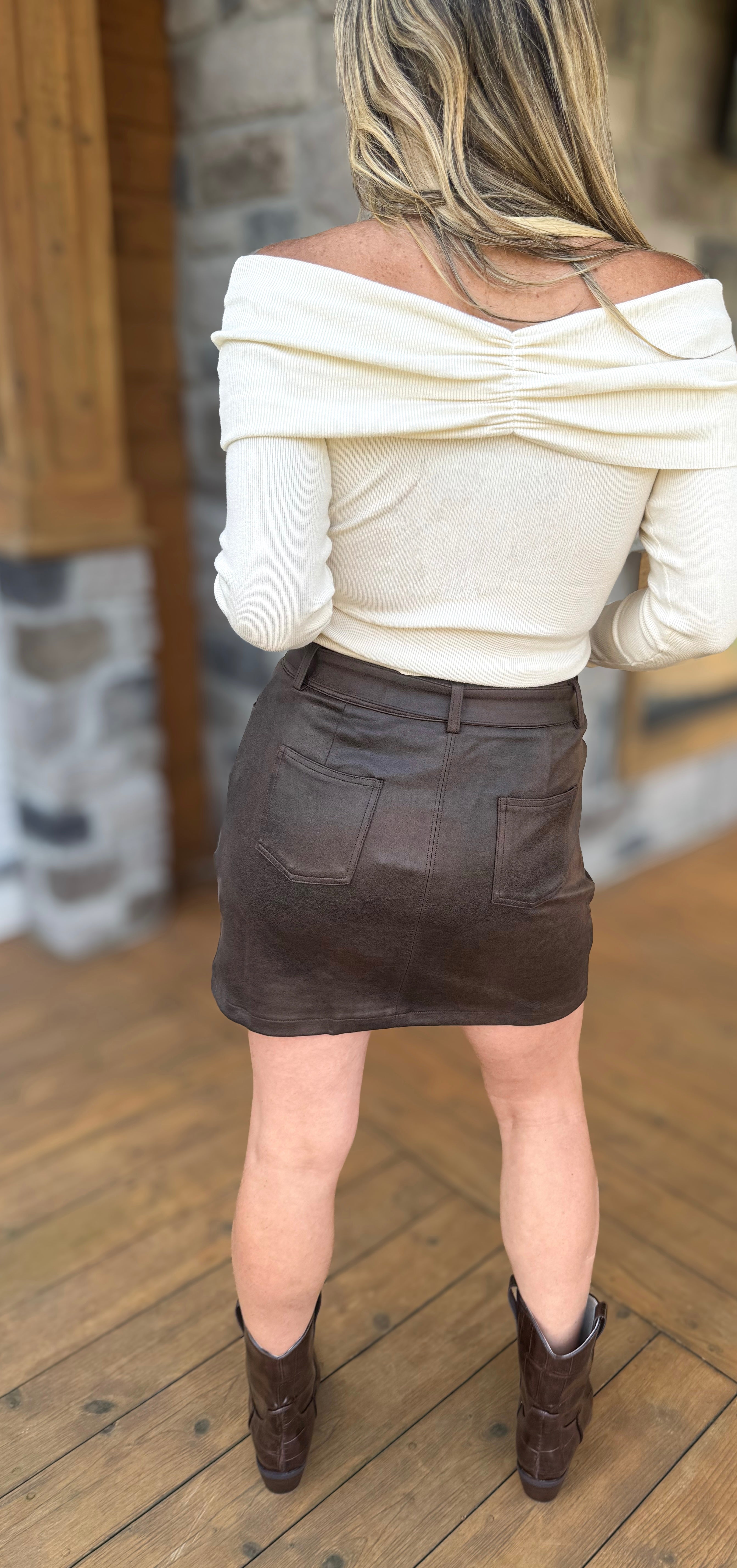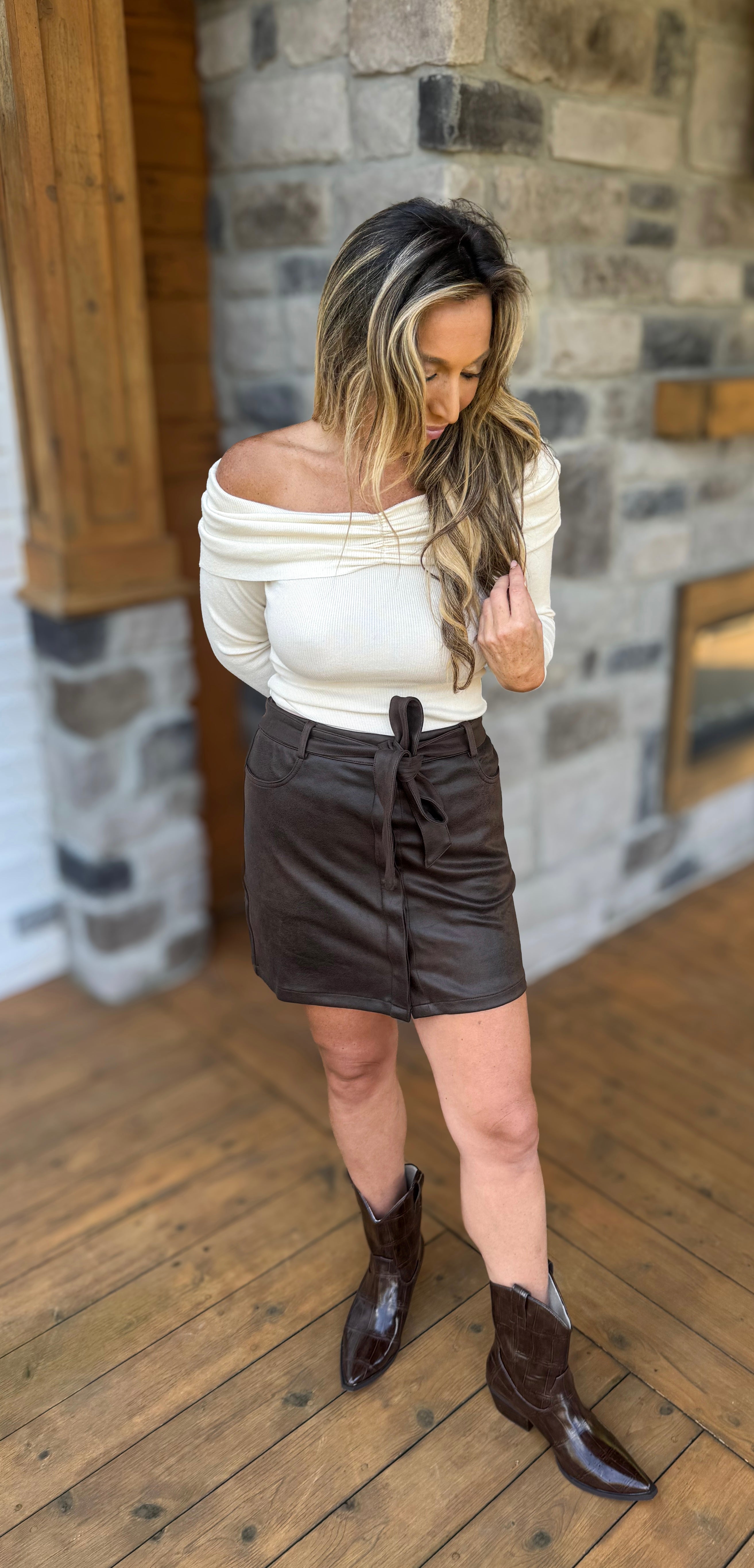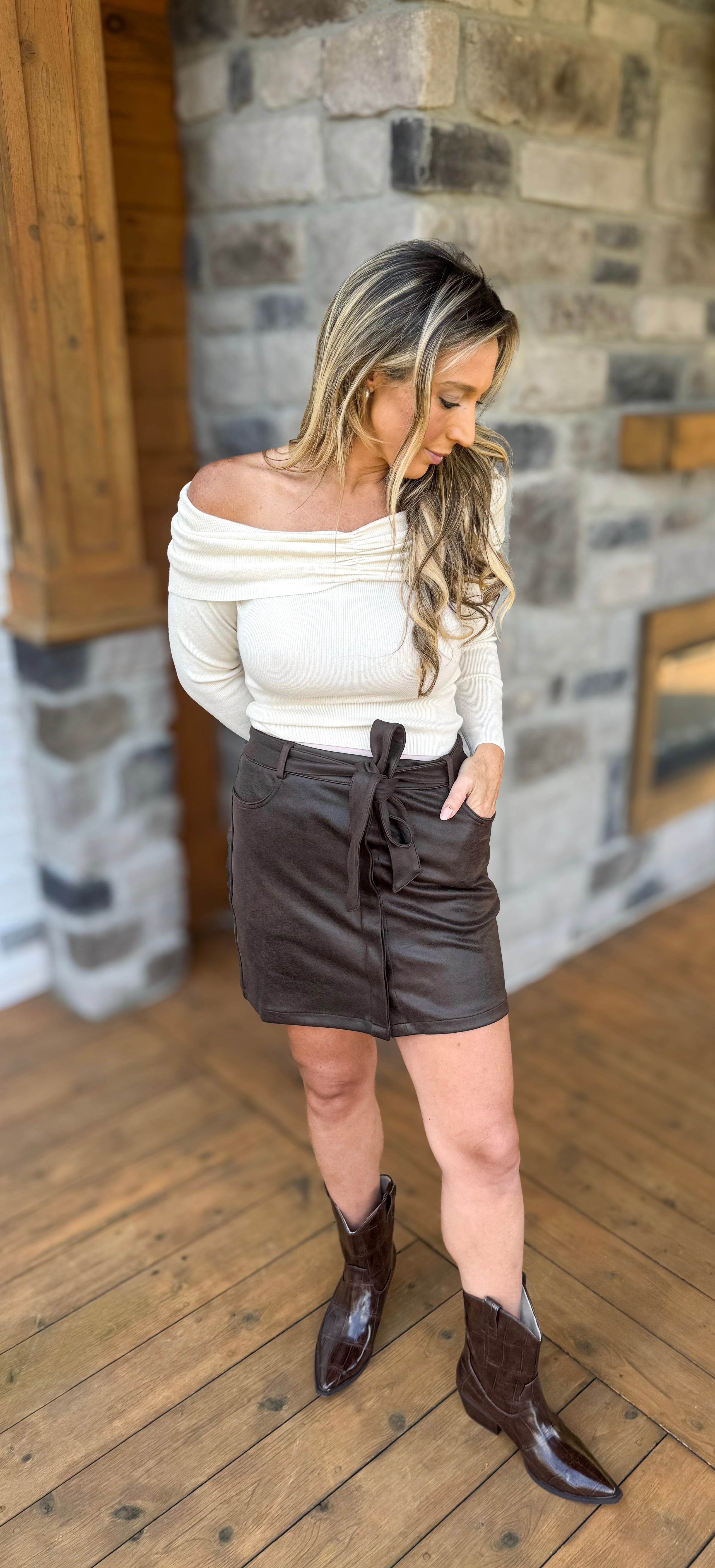 Polished edge with a soft-structured twist. The Gigi Skirt is a high-waisted, faux leather mini in a warm chestnut brown—complete with a front button closure, patch pockets, and a self-tie belt for a customizable fit. It blends classic tailoring with just the right amount of attitude, making it a versatile piece you’ll reach for season after season.