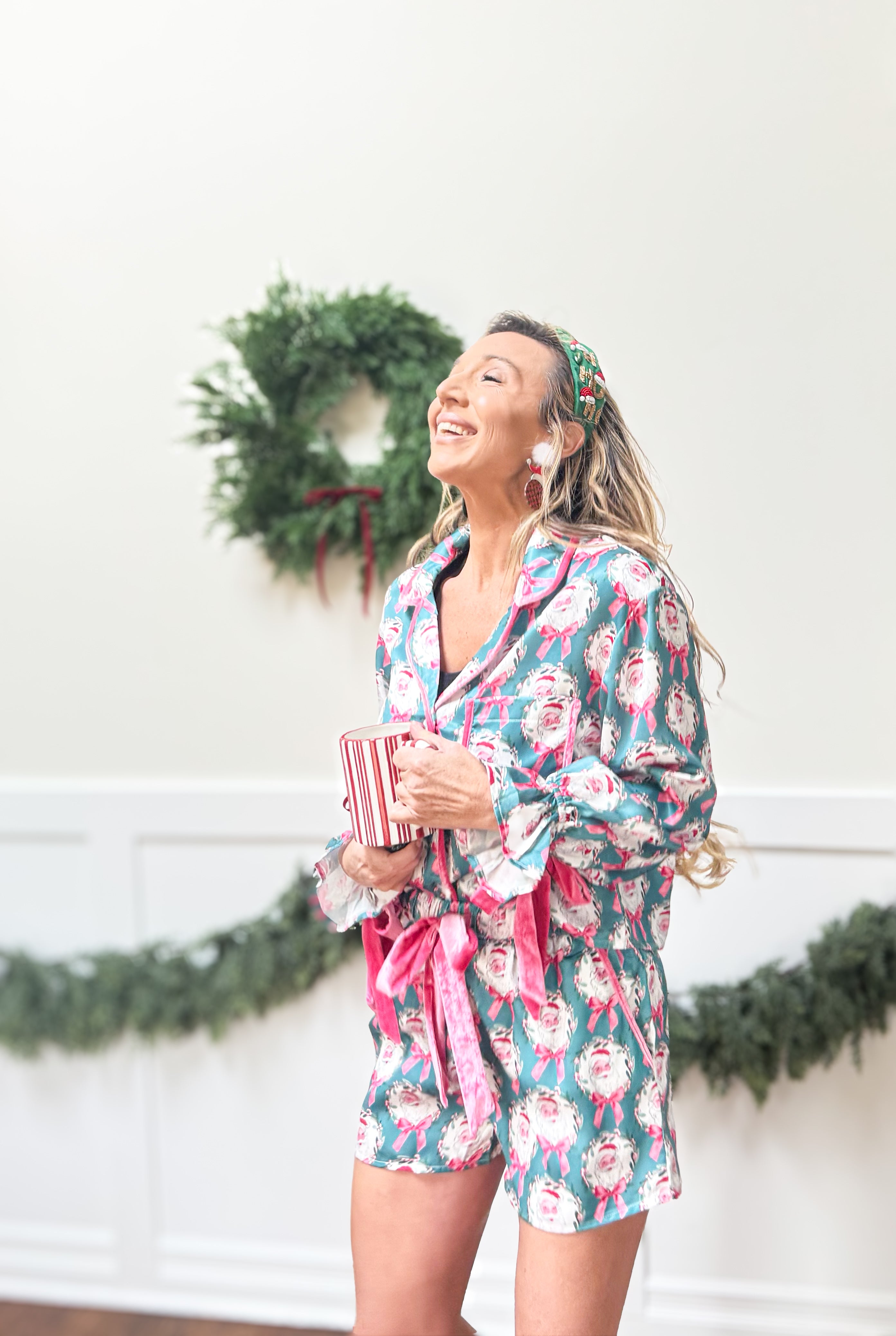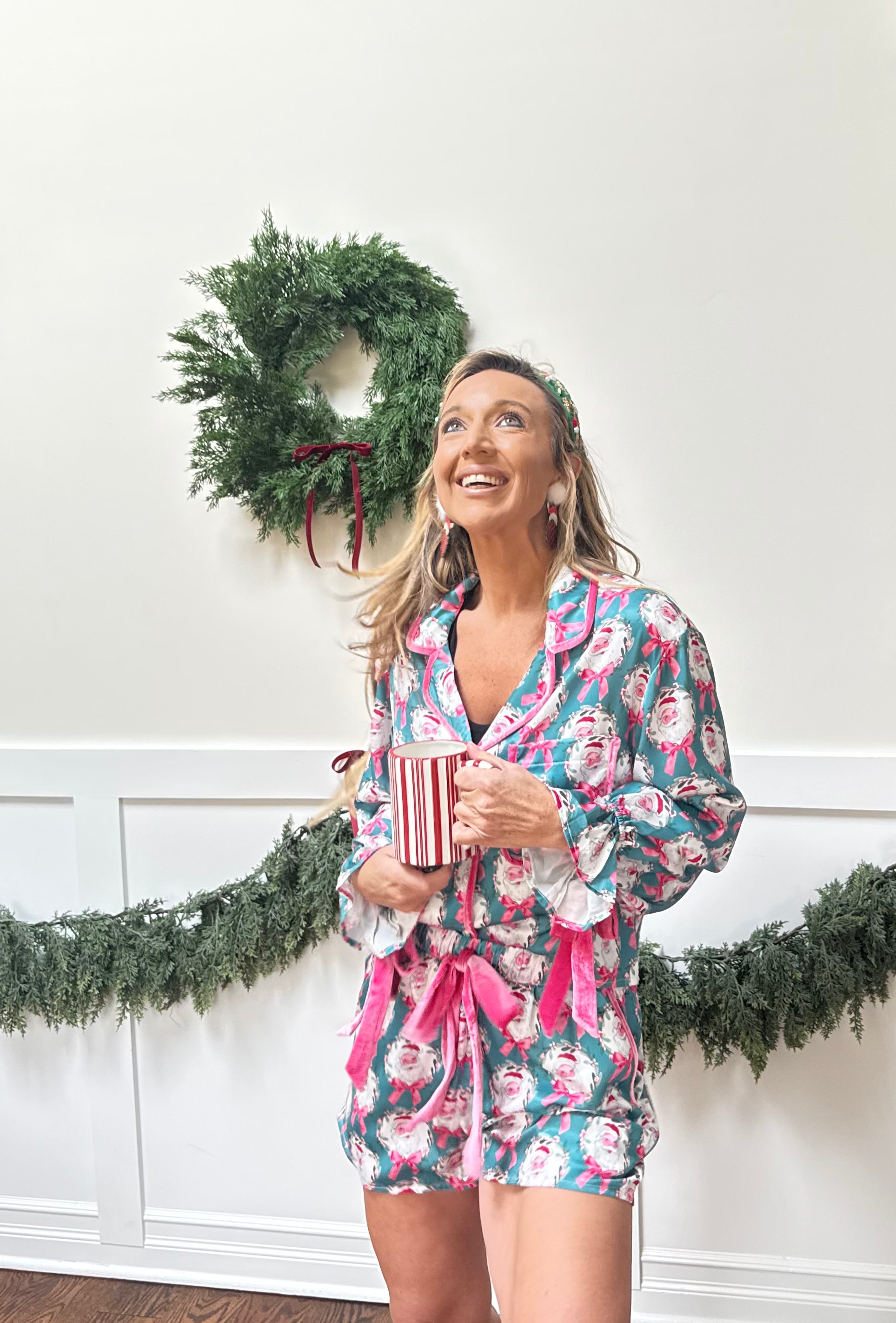 Timeless holiday charm meets cozy comfort — our Papa Noel PJs in cheerful teal are sure to bring festive vibes. With playful pink accents and a classic vintage Santa face, they’re perfect for lounging in style. The set features a button-down top and elastic-waist drawstring shorts for effortless ease, while pink velvet bow details add a touch of glamour. Designed to feel relaxed at home and ready for the holiday season.