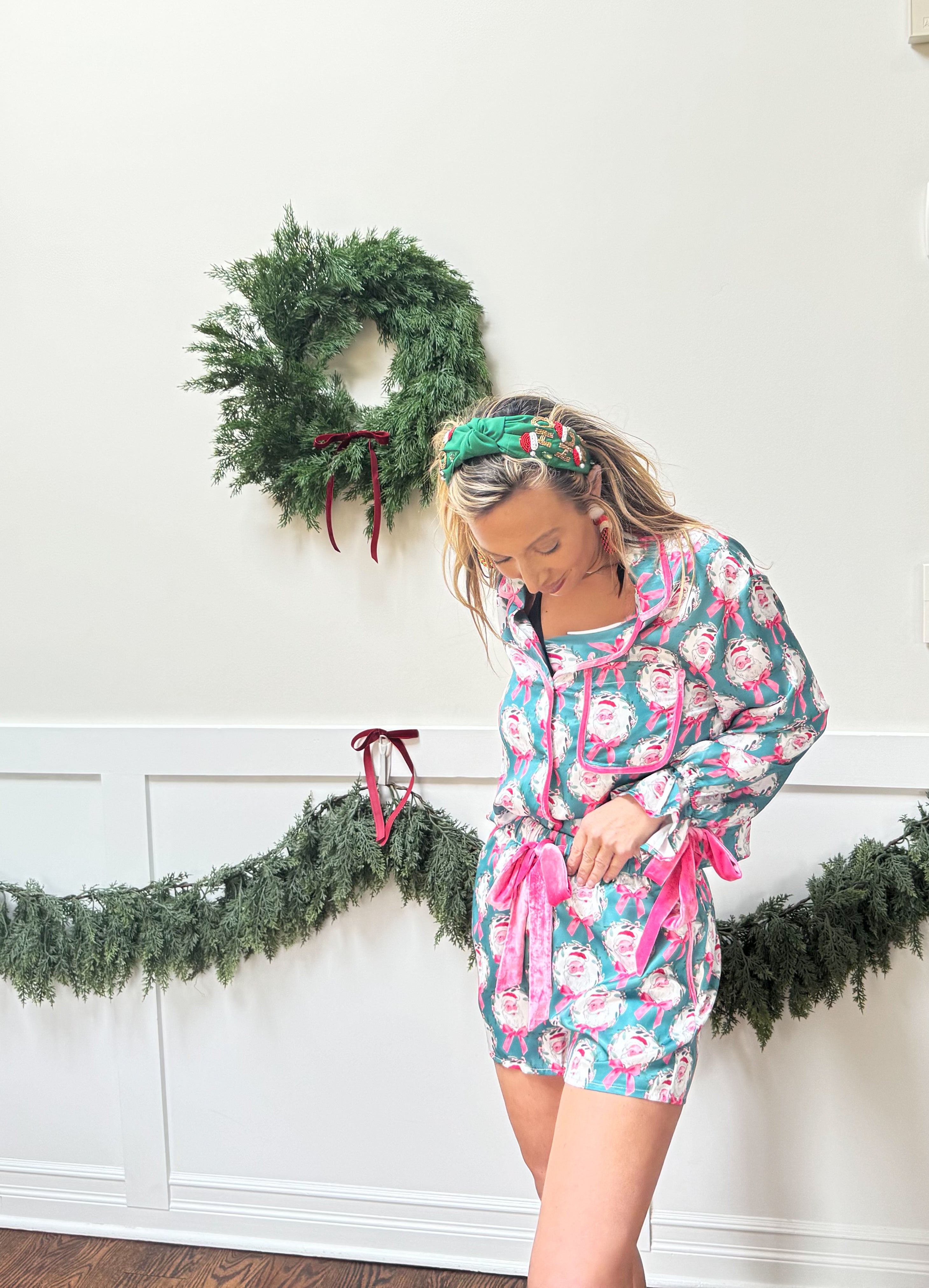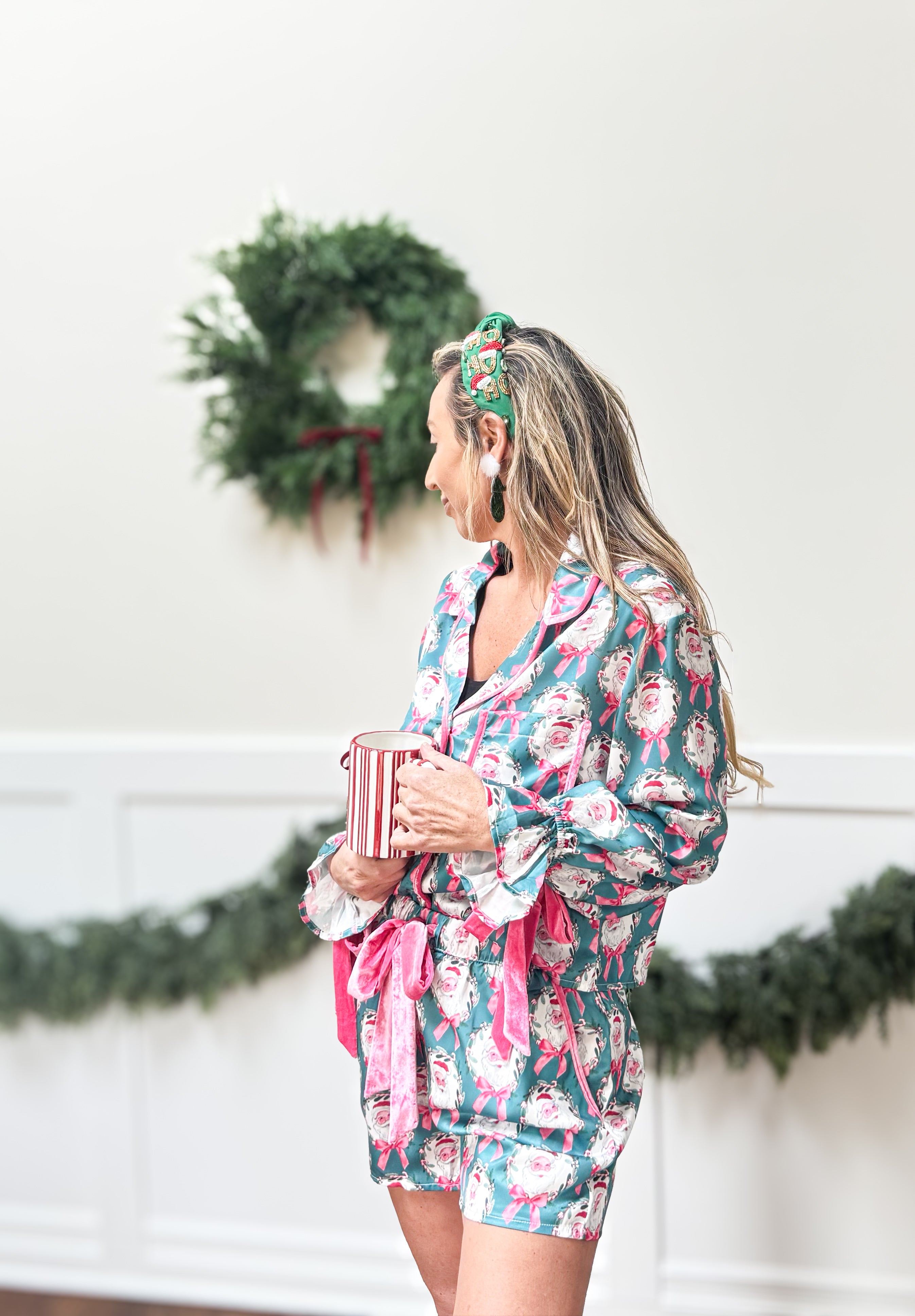 Teal short-set pajama featuring vintage Santa face & pink accents