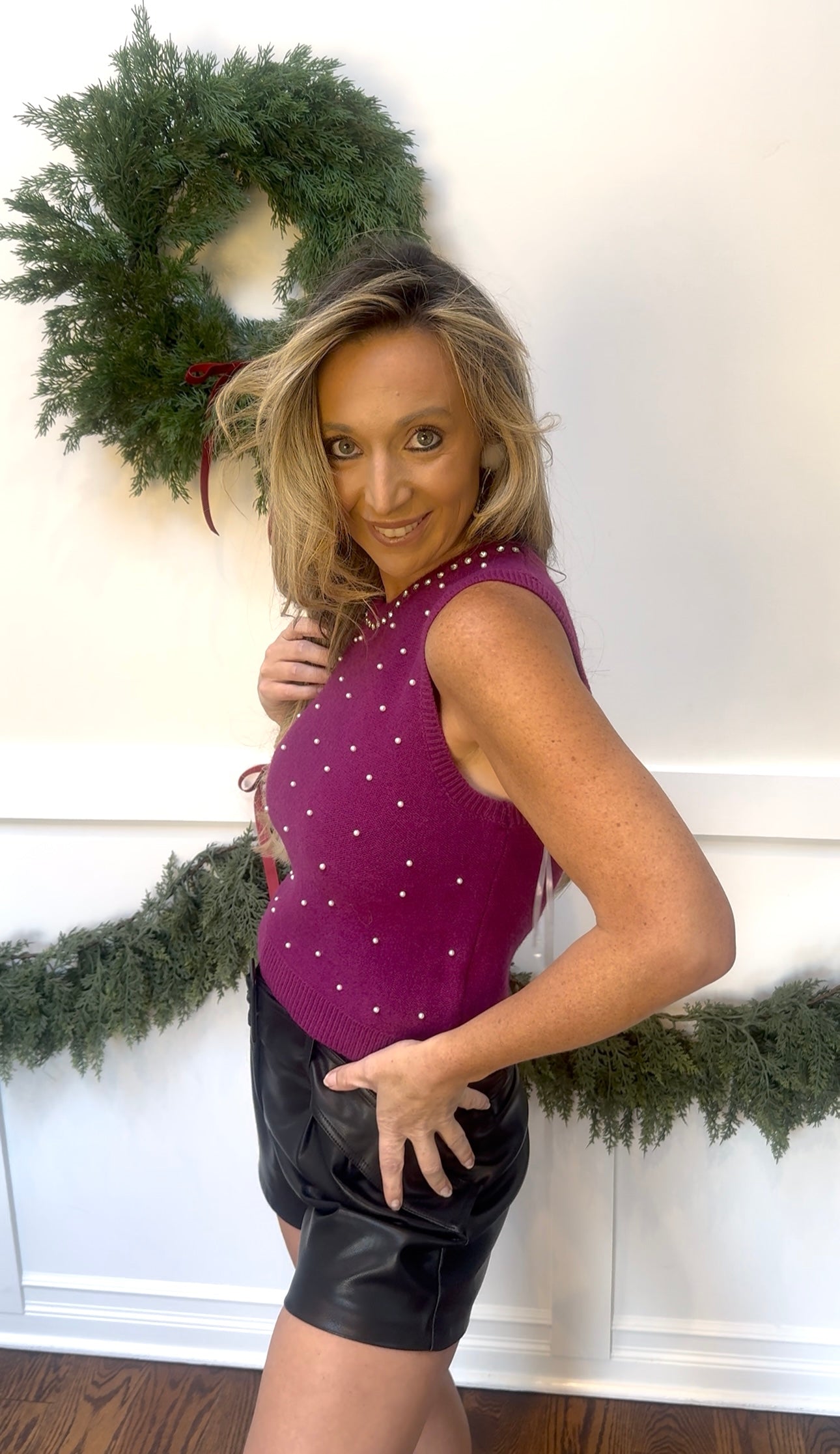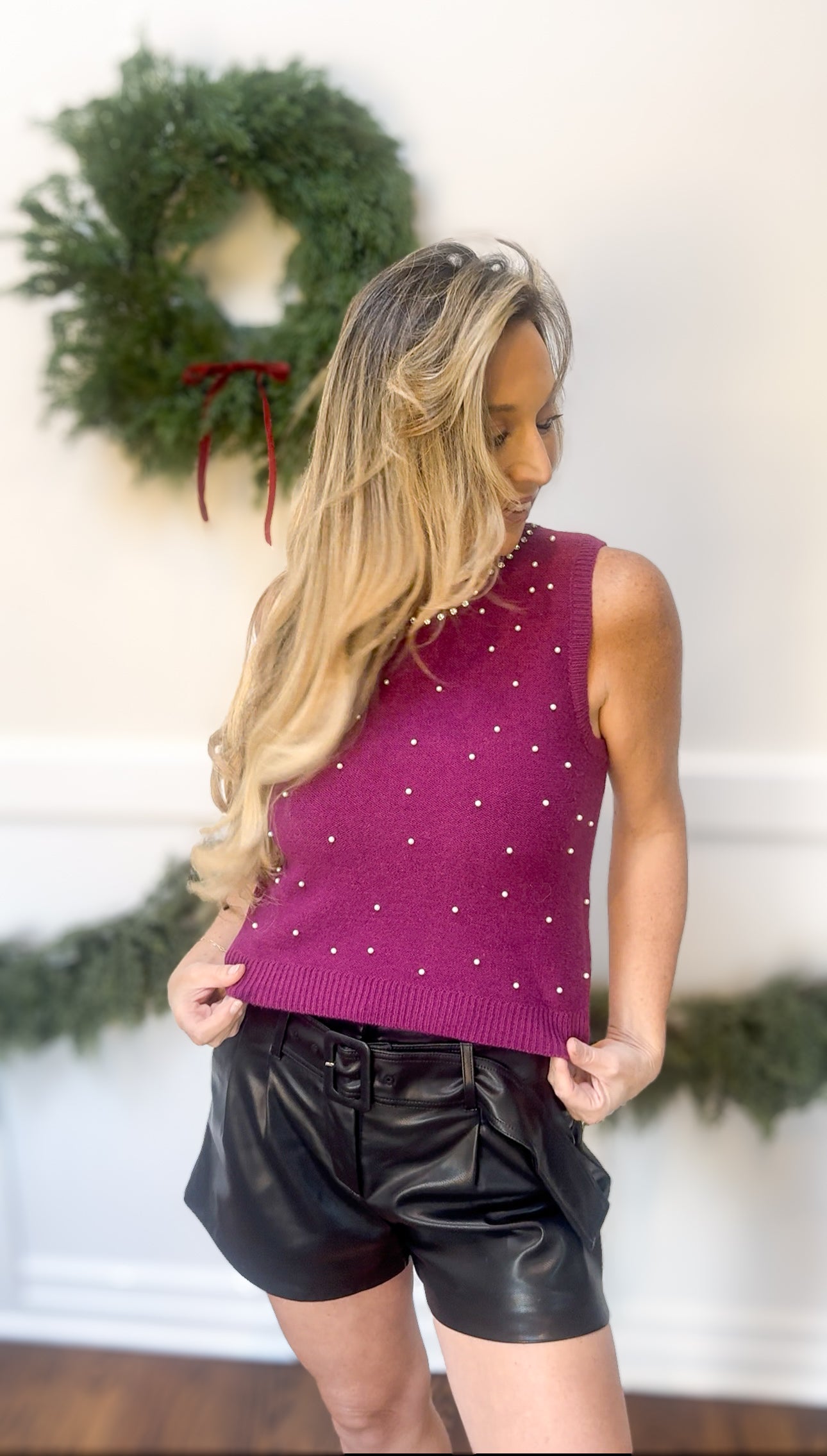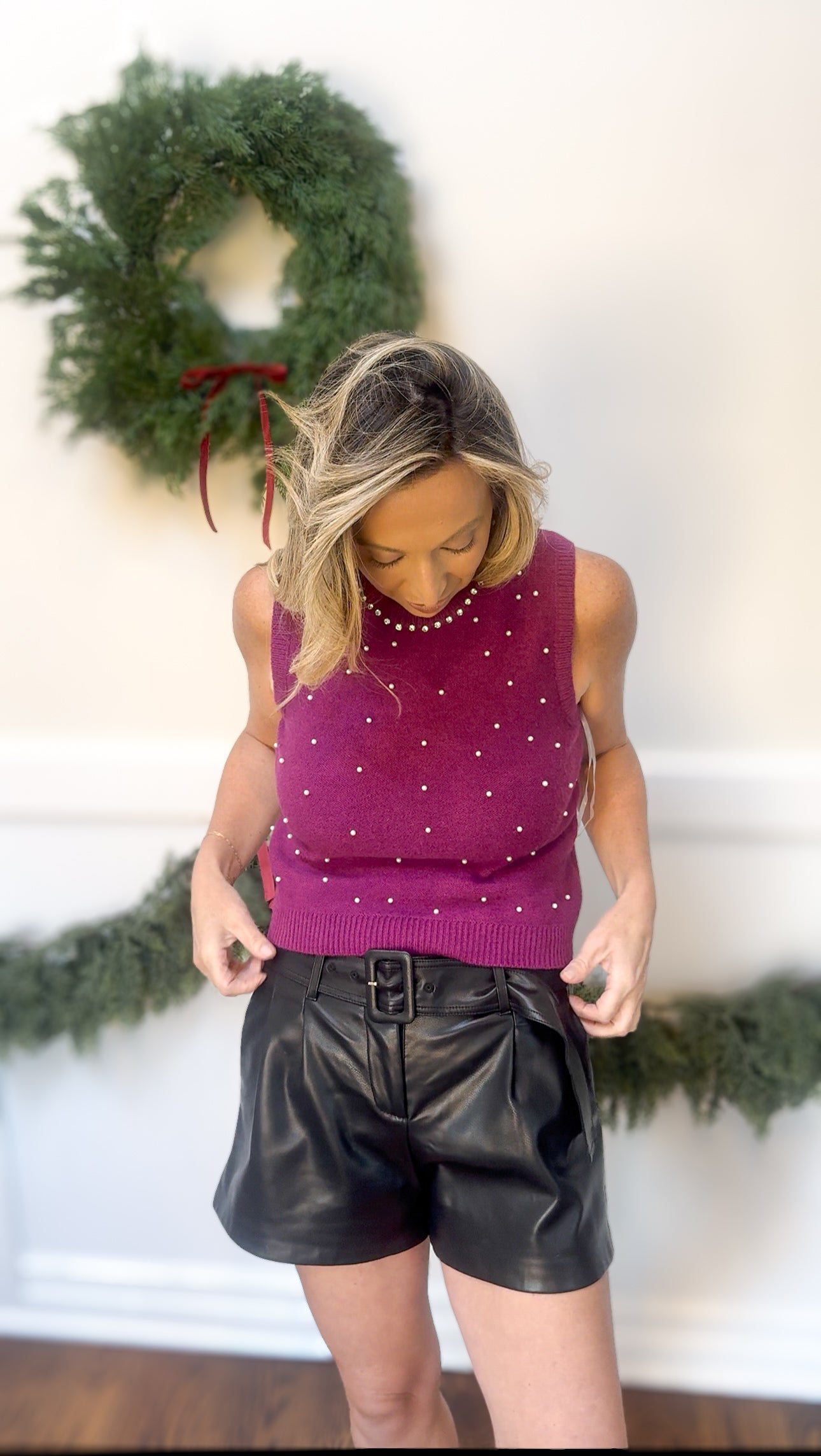 This sleeveless beauty features a rich plum knit that’s soft, stretchy, and oh-so-comfy. Sparkling rhinestone embellishments add a touch of glam, making it perfect for a girls’ night out, holiday event, or whenever you want to shine a little brighter. The ribbed neckline, armholes, and hem give it a flattering, structured fit that pairs perfectly with denim, leather pants, or a chic mini skirt.