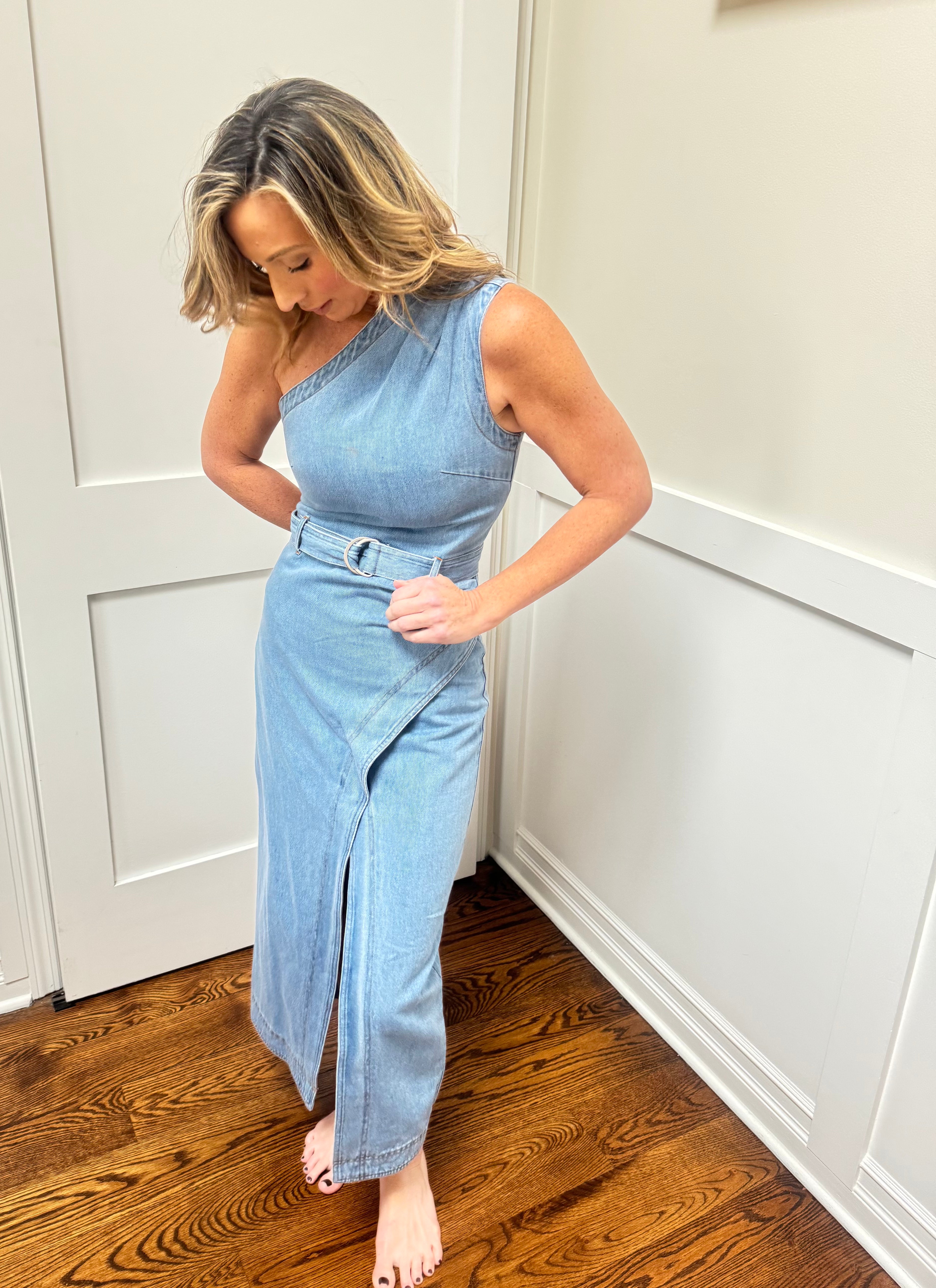 Denim One Shoulder Dress with Slit & Belt – Edgy & Elegant