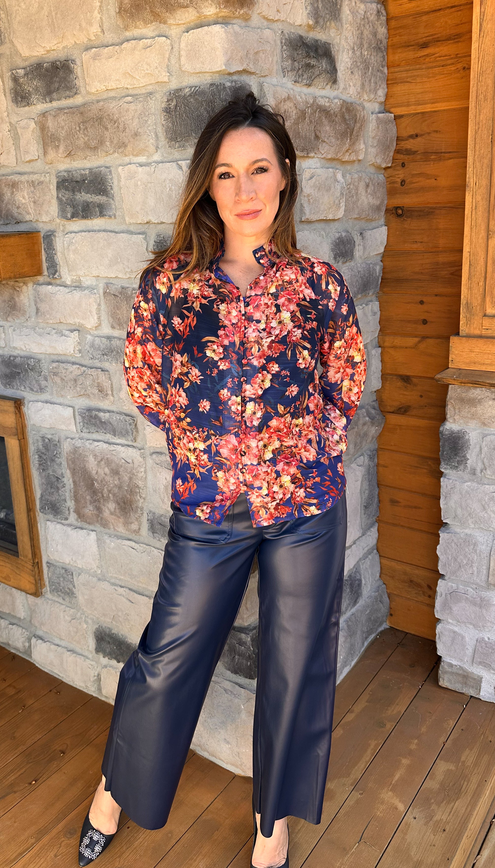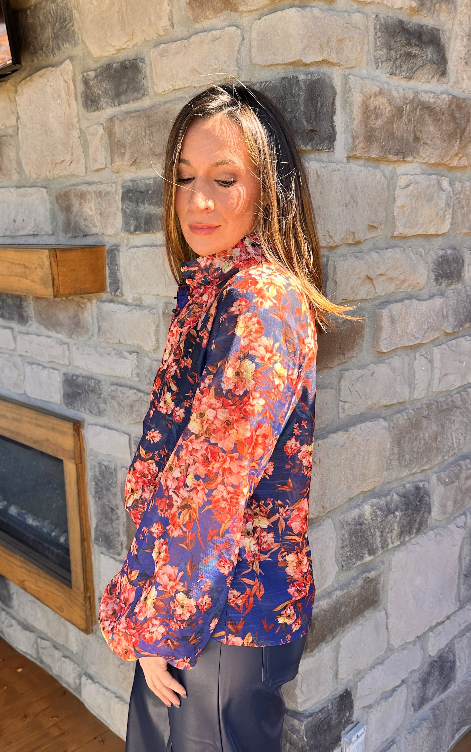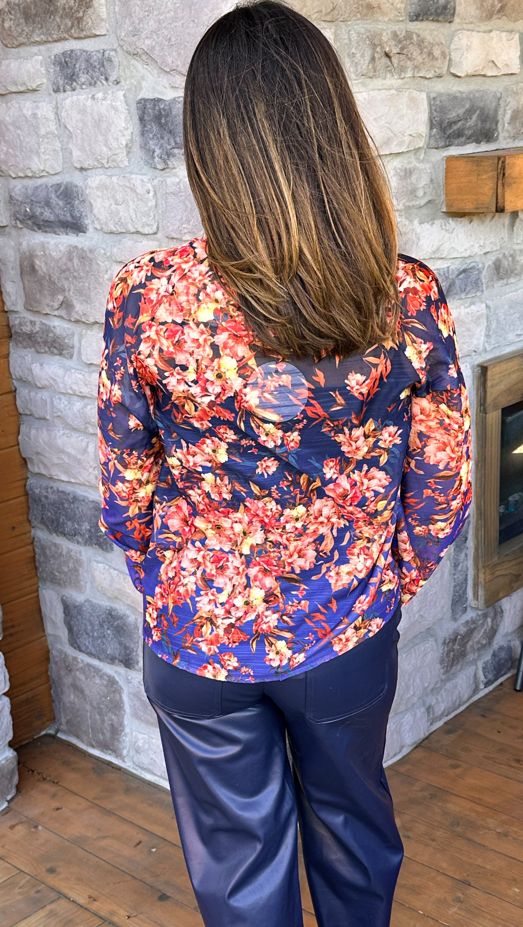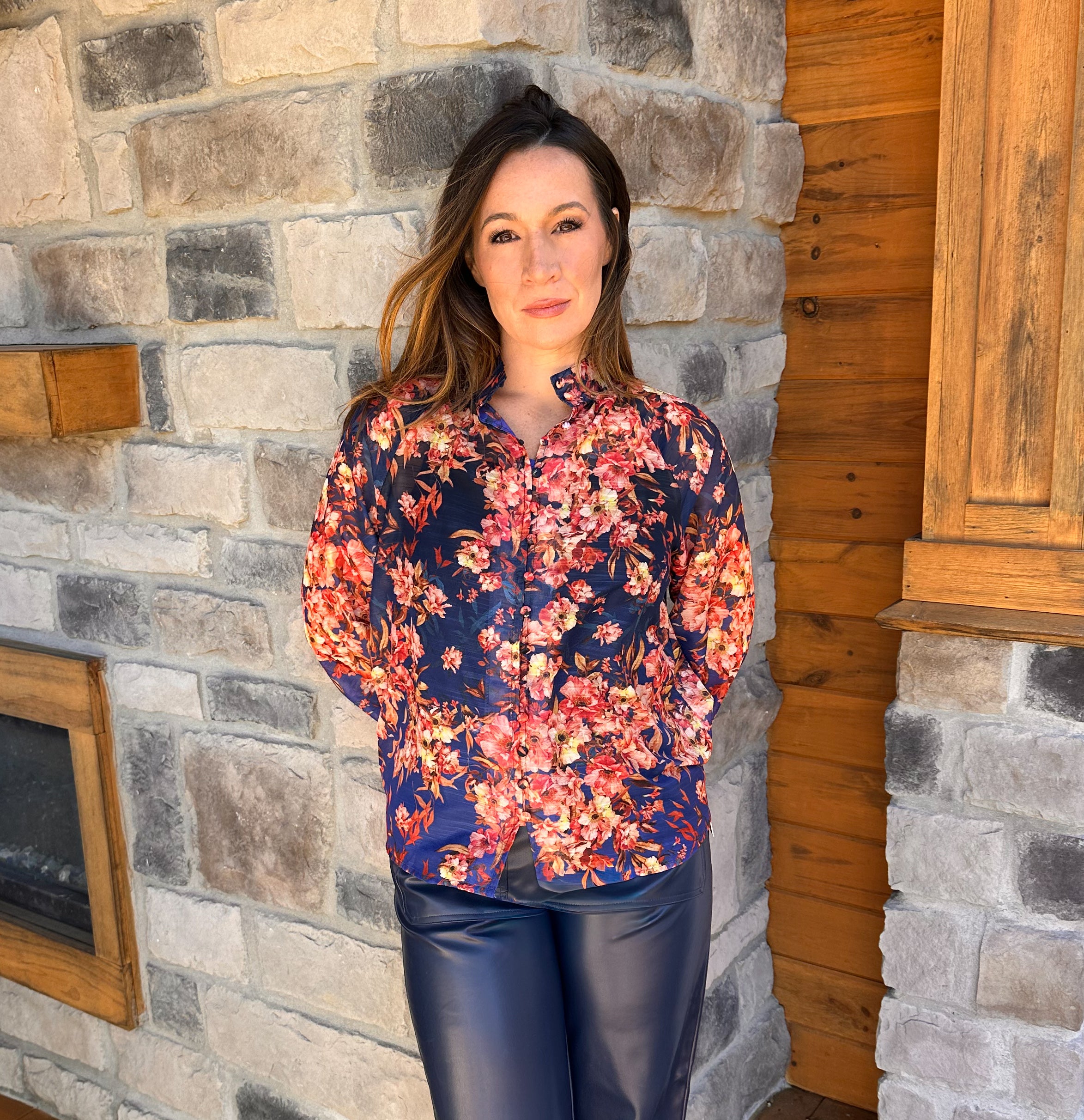 Welcome fall in full bloom with our Autumn Floral Top — a sheer, feminine piece that captures the beauty of the season. Set against a deep navy backdrop, delicate florals in warm gold and orange tones add just the right touch of seasonal charm. With a soft mock neckline and relaxed fit, this top brings elegance and ease to your everyday style.