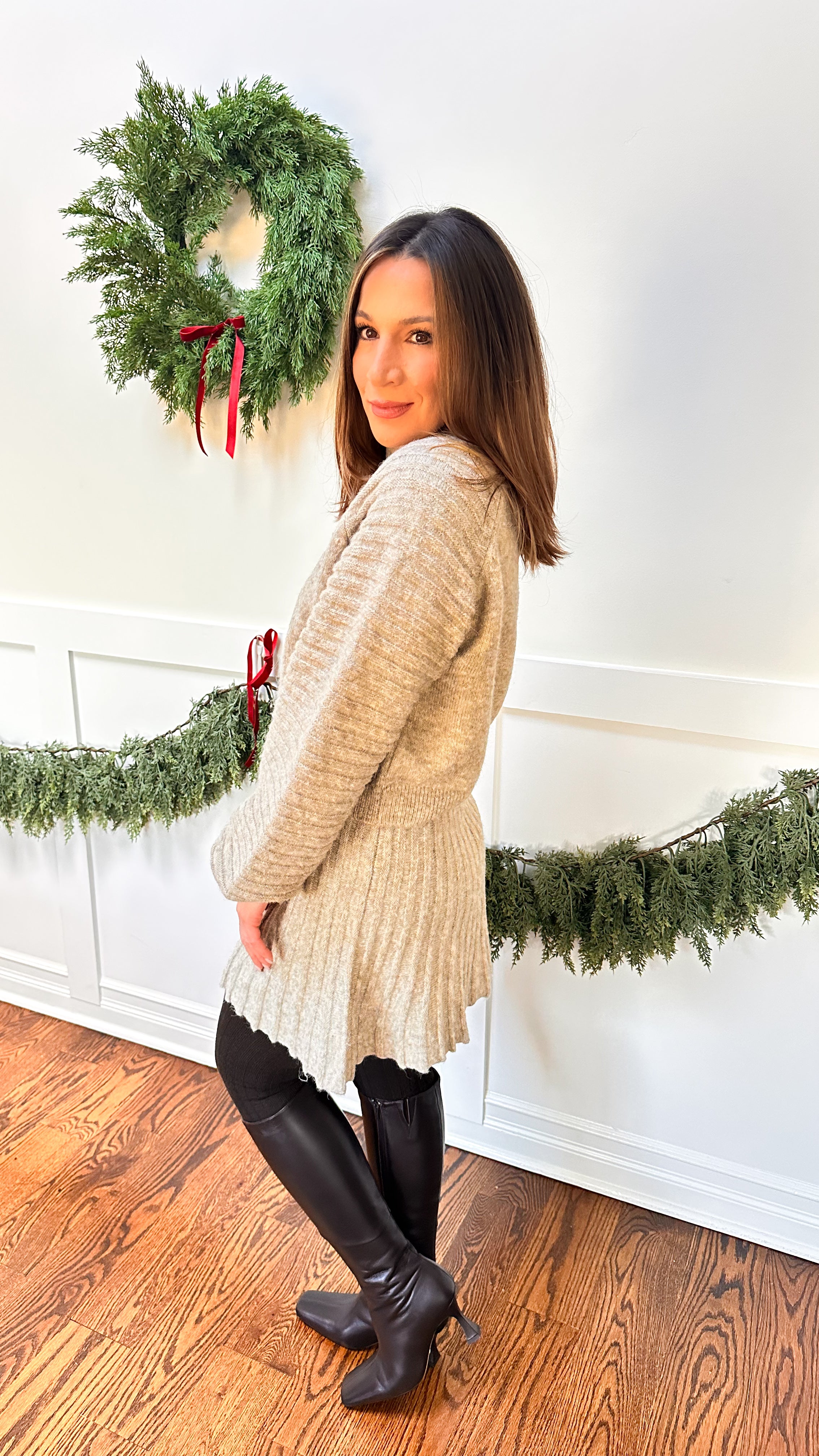 Cozy, feminine, and effortlessly polished — The Campbell Set is your new go-to matching moment. This oat-colored knit set includes a soft sweater with a subtle balloon sleeve and ribbed detailing at the cuffs and hem, paired with a perfectly pleated mini skirt that adds movement and charm.