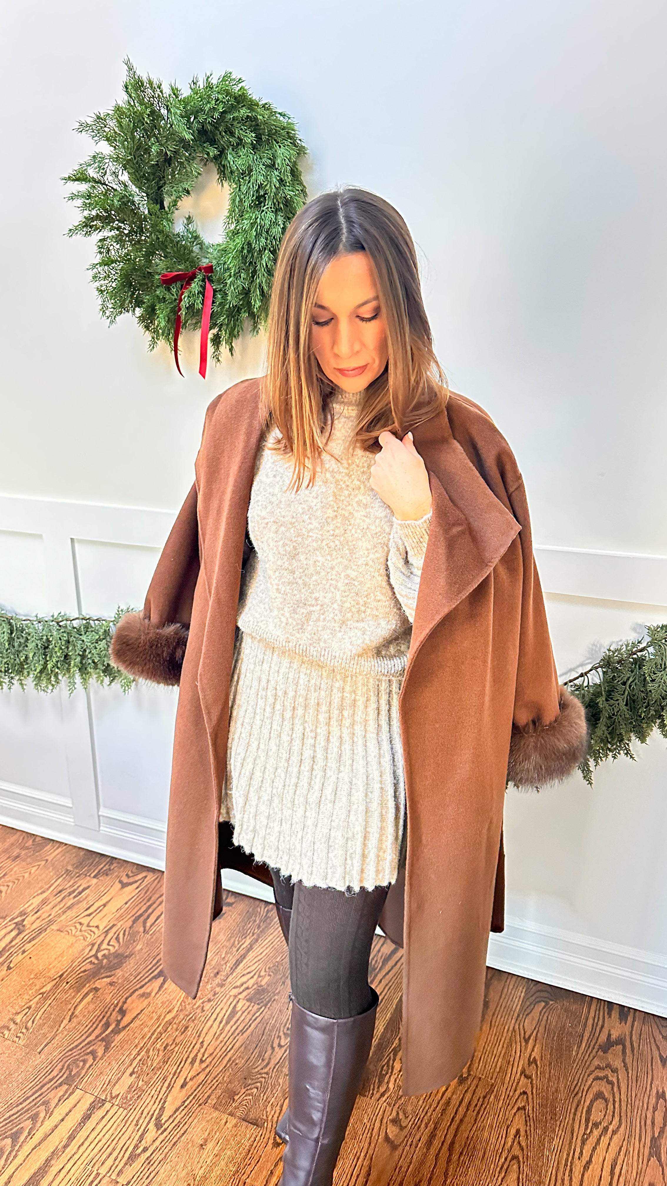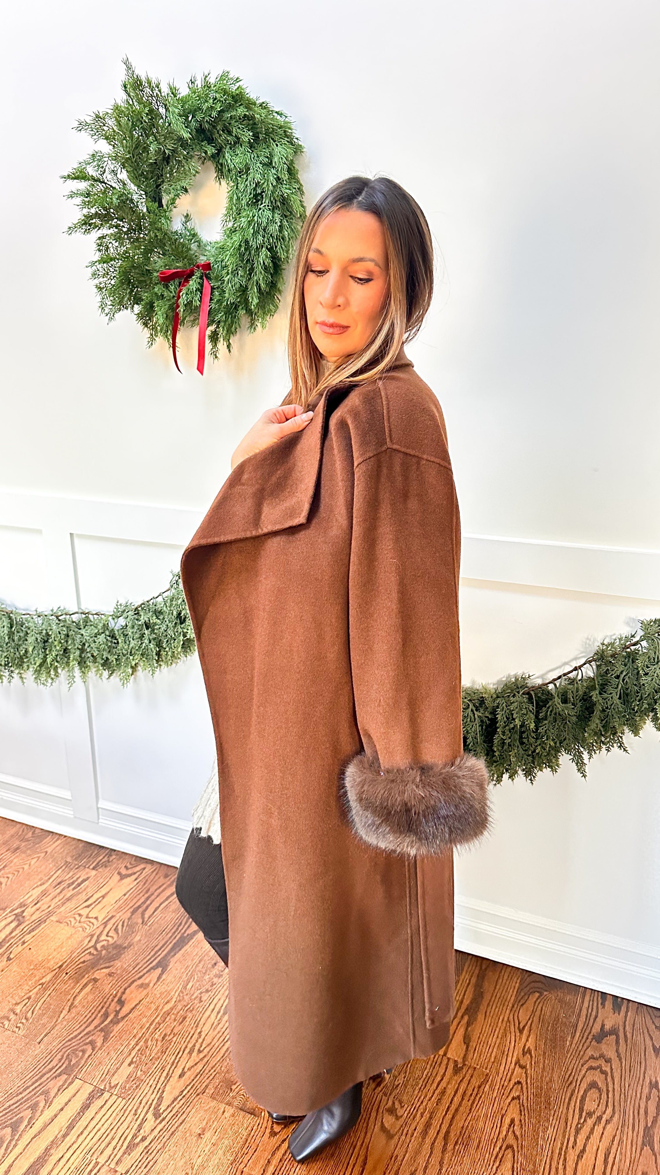 Its standout detail: fully removable faux fur sleeves that let you switch up your look instantly. Wear it without the fur for a clean, classic everyday coat — or attach the plush faux fur sleeves for a dramatic, elevated, après-ski–inspired moment. Two looks in one, both equally stunning.