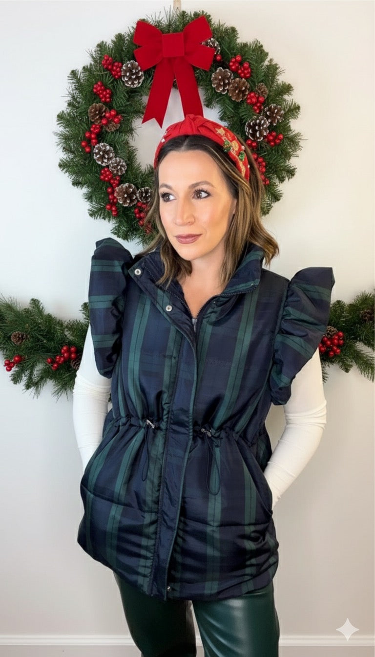 Flaunt your fashion-forward style with the Blackwatch Ruffle Vest! Stay warm and trendy with this puffer vest, featuring on-trend ruffle sleeves and an adjustable waist for a flattering fit. In a classic Blackwatch plaid, this vest will elevate any outfit and keep you cozy on chilly days.