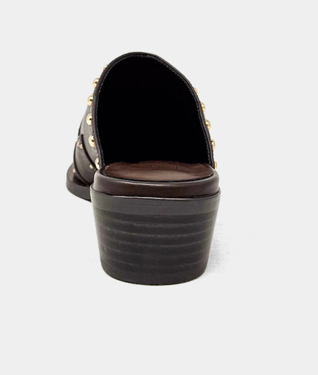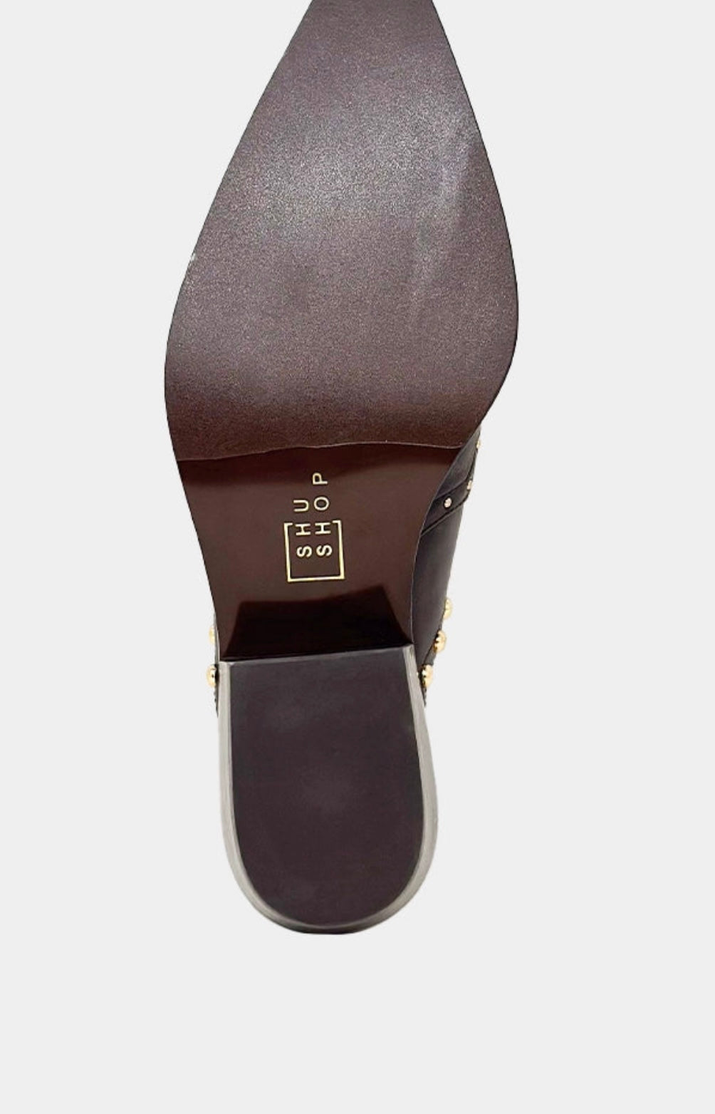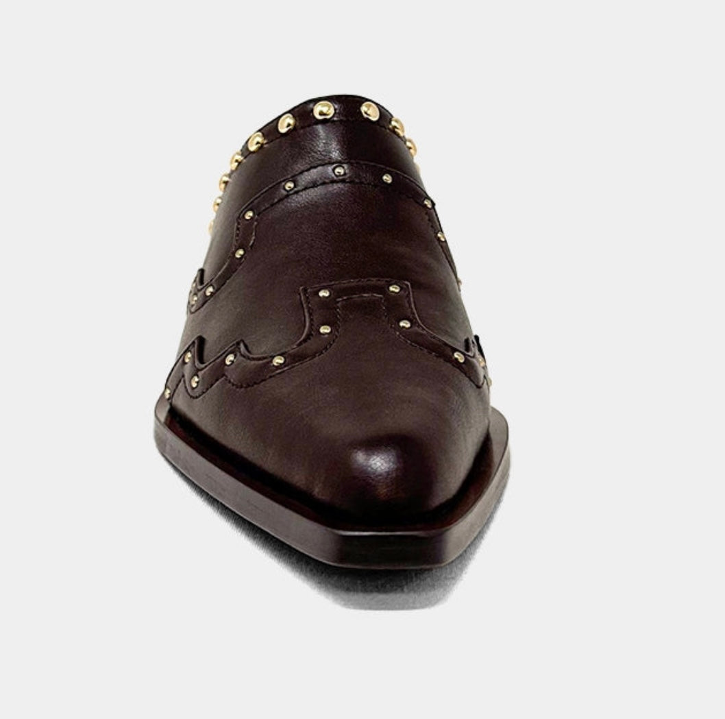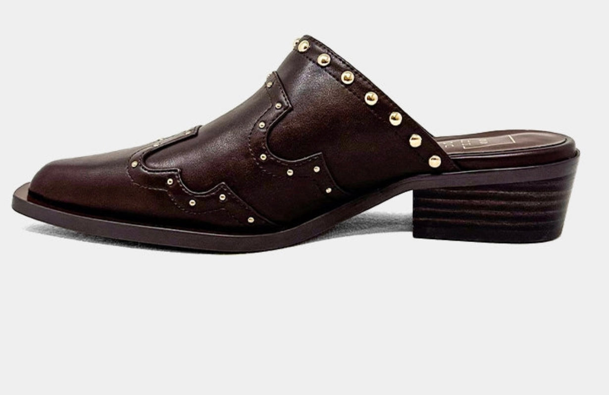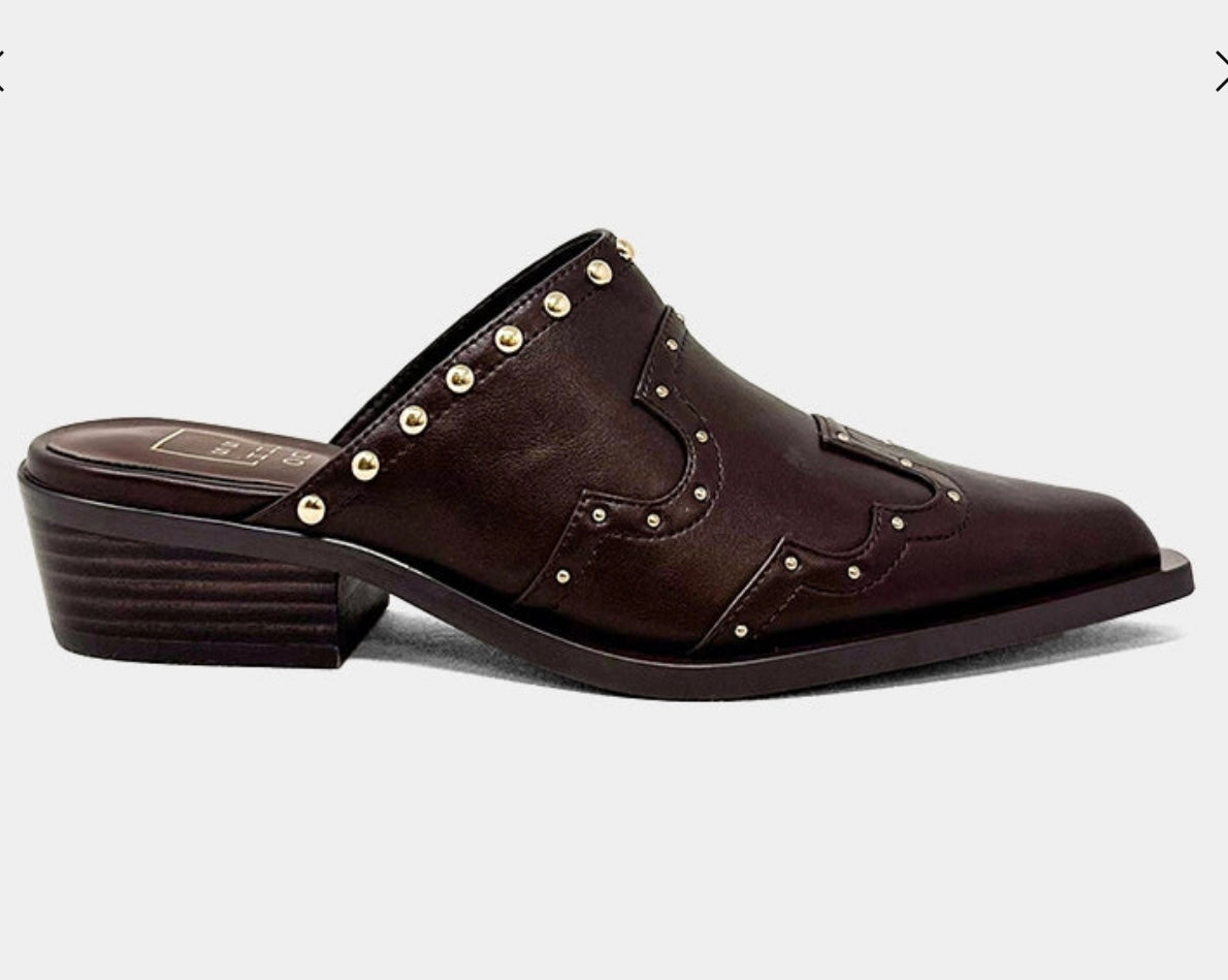 Western charm, modern twist. THALIA in Nude brings a laid-back, statement-worthy vibe to your wardrobe. This mule features tonal western stitching, antique gold studs, and a sleek pointed toe-perfect for when you want to feel a little country, a lot chic.