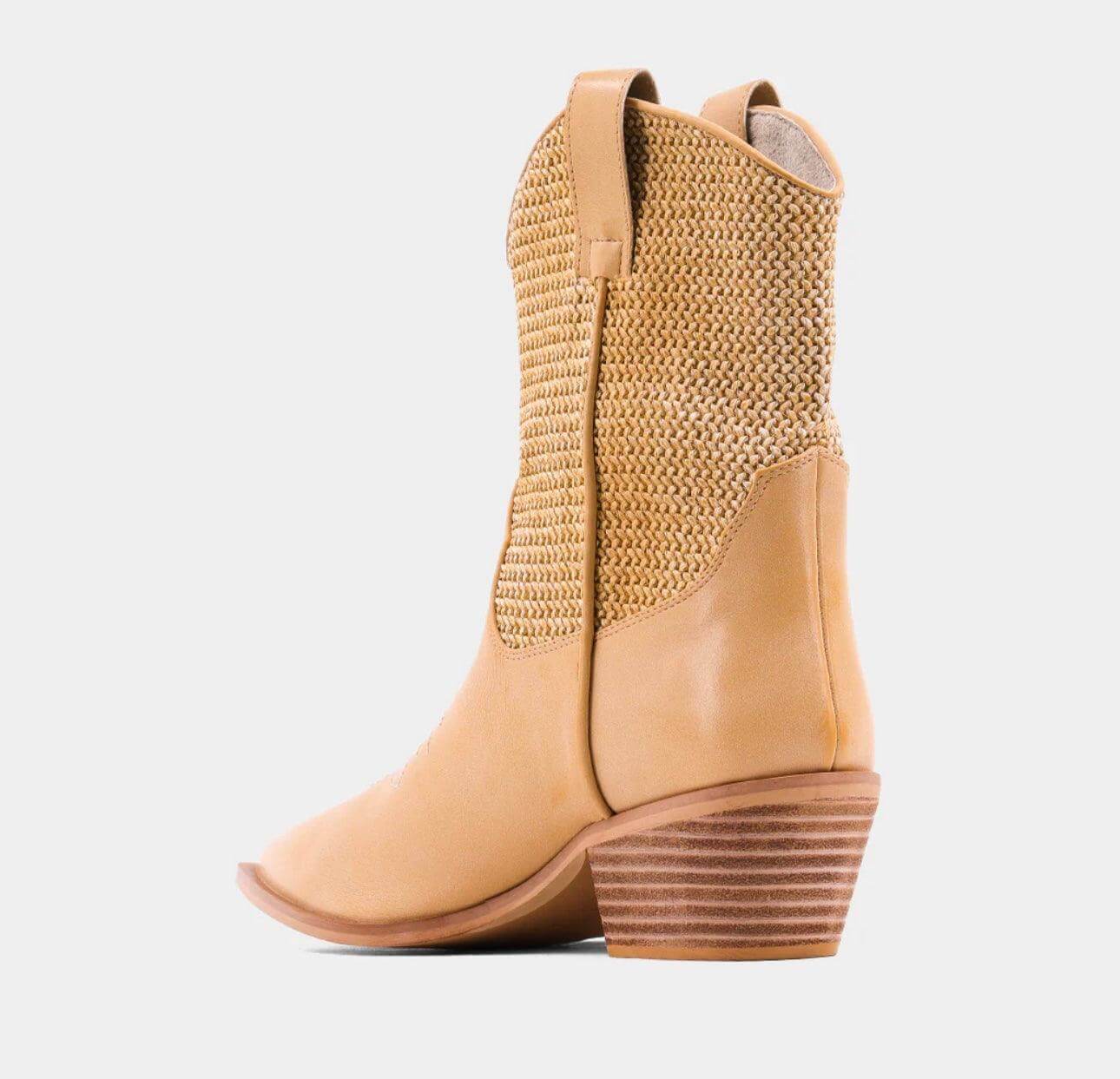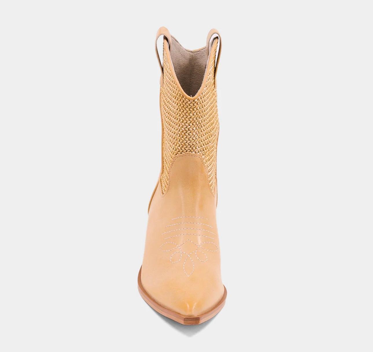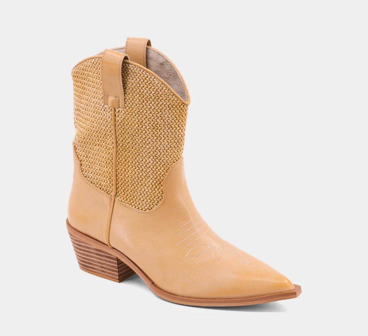Western charm meets breezy texture with the ZAHARA boot in Natural Woven. Featuring a woven raffia upper paired with faux leather detailing, this cowboy-inspired boot is the perfect mix of rustic and modern. The stacked block heel and pointed toe add classic Western appeal, while the intricate stitching gives it a refined edge. Whether styled with denim or flowy dresses, this standout piece is ready to turn heads all season long.