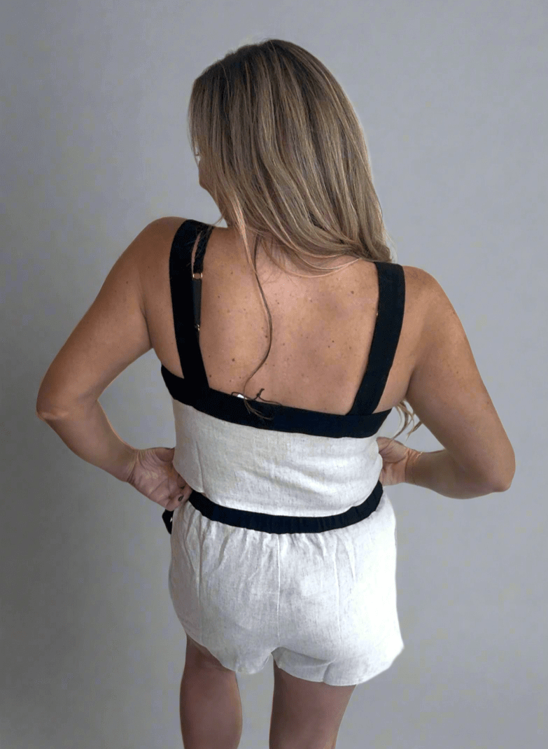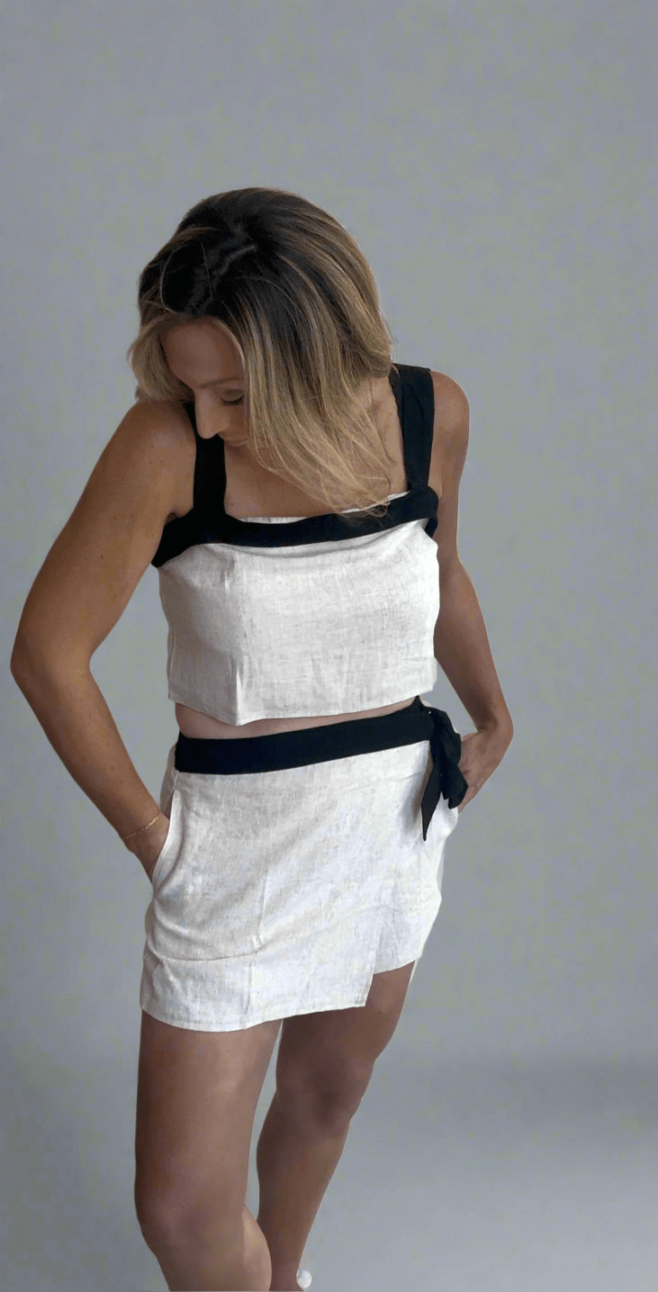 Elevate your summer wardrobe with the Paloma Linen Skort Set, crafted in breathable tan oat linen accented by sleek black trim. The cropped tank offers a chic, flattering fit, while the matching skort features a stylish wrap front and comfortable shorts in the back, secured with a black tie waist trim. Perfect for effortless style and all-day comfort, this set blends sophistication with practicality for your warm-weather adventures.