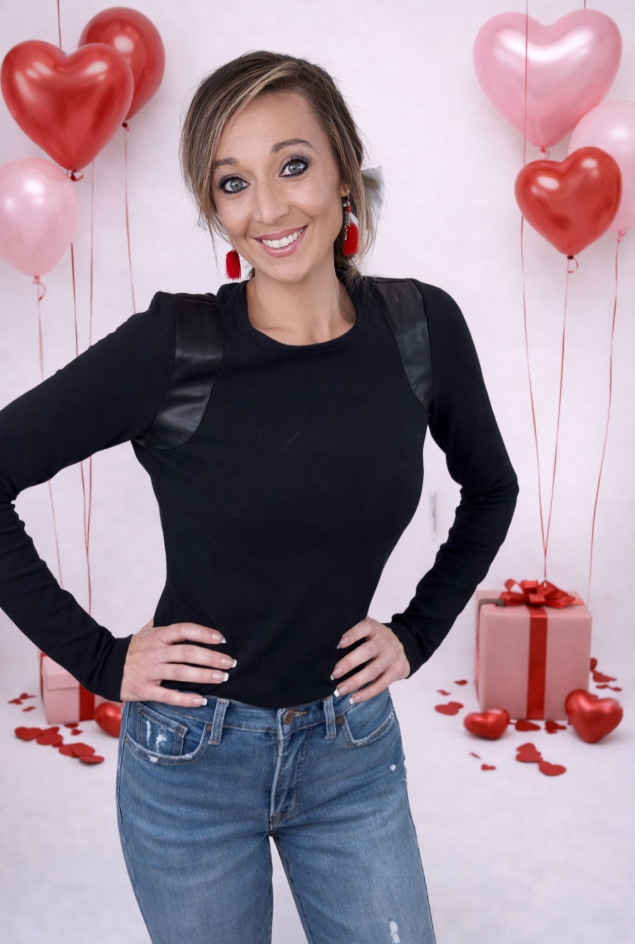 Black long sleeve with faux leather detail at the shoulder