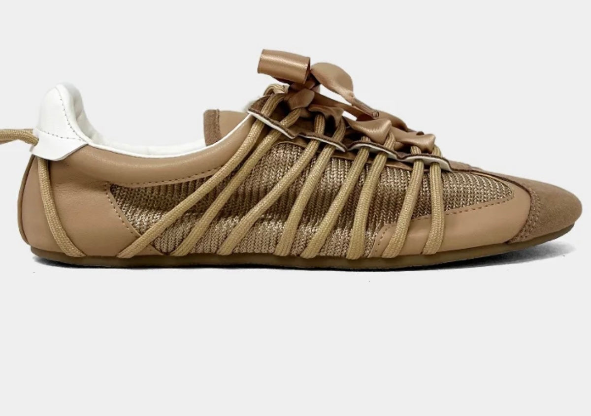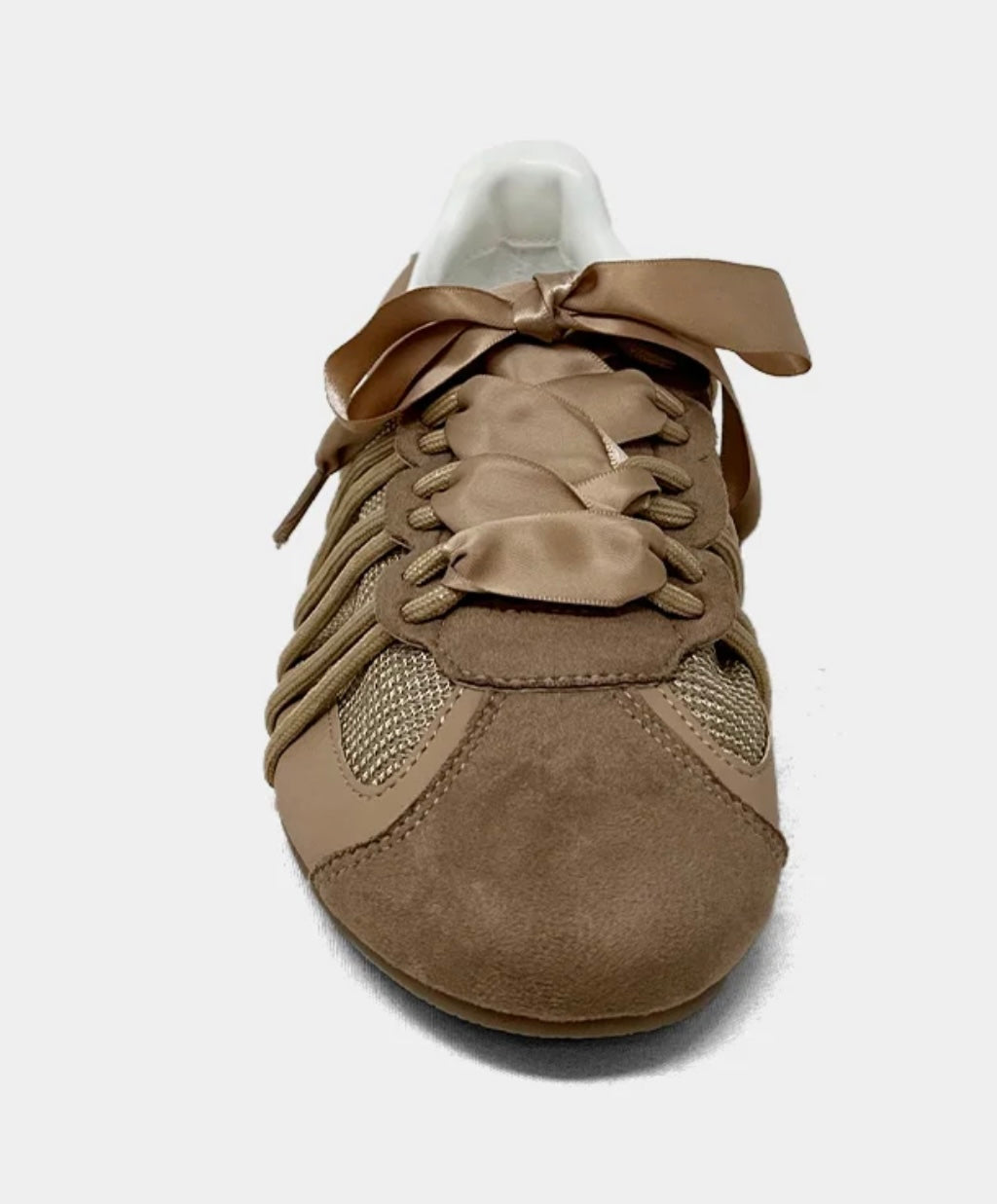 SHERYL in Taupe blends earthy tones with feminine charm in a ballet-meets-sneaker silhouette. Its warm taupe hues, airy mesh upper, and satin ribbon laces make it the perfect style for transitional dressing. Light on your feet, rich in detail, this is effortless sophistication for the everyday muse.