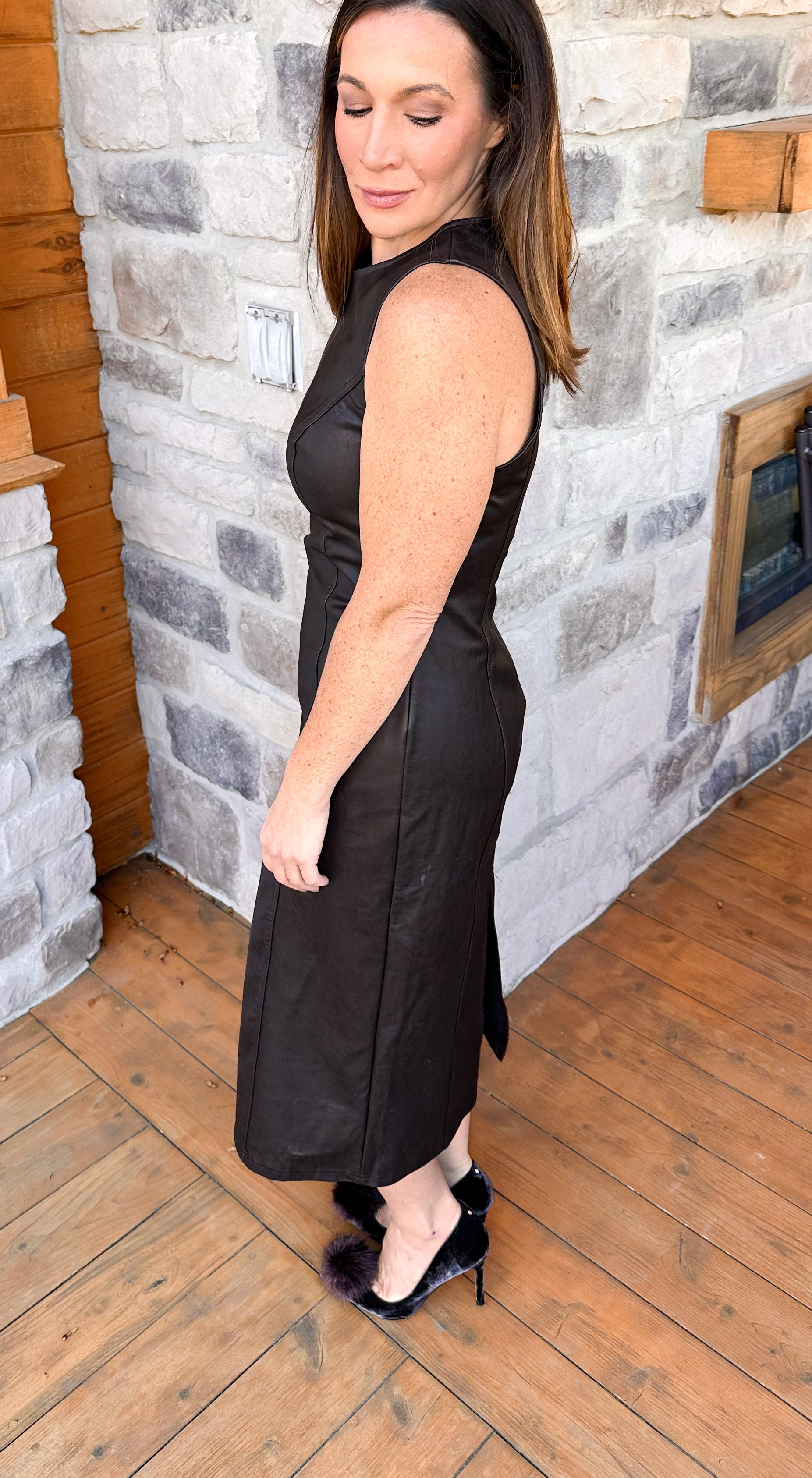 Meet your new go-to dress — a chocolate brown faux leather sleeveless midi that’s effortlessly chic with an edge. Crafted to flatter with a sleek silhouette, this dress brings a modern touch of luxury to any occasion, from nights out to special events. The rich faux leather adds depth and texture, making it a standout piece in your wardrobe.